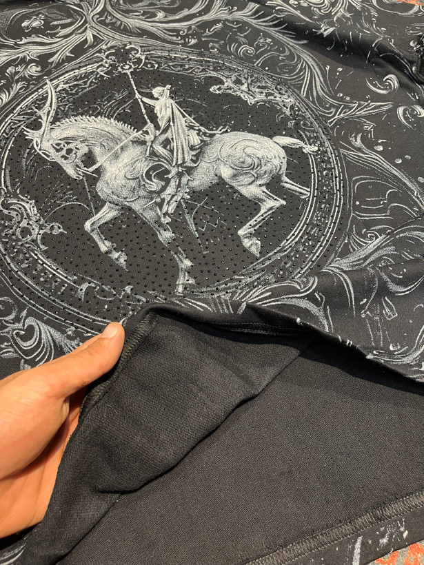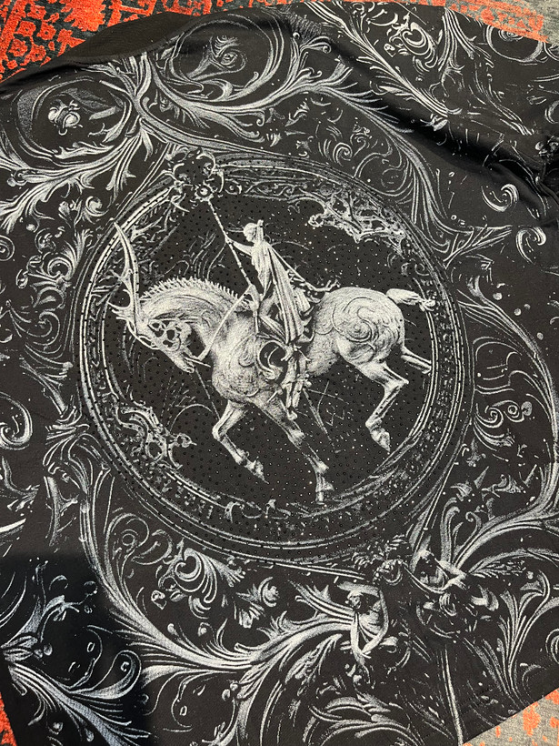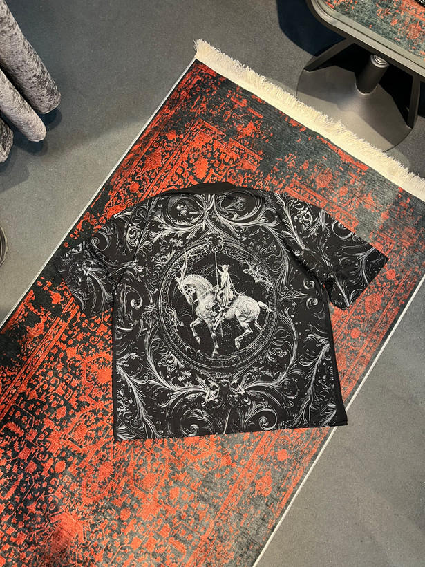 تيشرت طرح شواليه يه كار مشكى كاستوم شده است از اون تيشرتا كه تن هركسي نيست پشتش نگين كاري با كيفيت همراه يه طرح خفن جنس پارچه ماكان خوش كپ و خفن و اينكه قواره و كپ كار باكسى